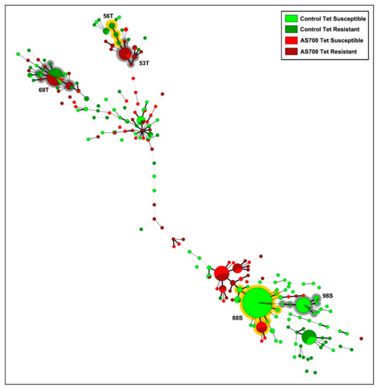 3.6. Administration of AS700 to Cattle Reduced the Richness of Campylobacter jejuni Subtypes