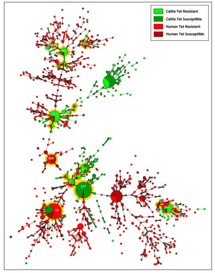 - De Haan, C.P.; Kivisto, R.I.; Hakkinen, M.; Corander, J.; Hanninen, M.L. Multilocus sequence types of Finnish bovine Campylobacter jejuni isolates and their attribution to human infections. BMC Microbiol. 2010, 10, 200. [Google Scholar] [CrossRef] [PubMed]