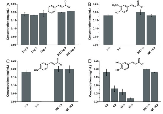Biotransformation of cinnamate (A) and its hydroxyl derivatives, ferulate (B), p-coumarate (C), and caffeate (D) by the B. licheniformis strain TAB7. Data are expressed as means ± standard deviation from triplicates. NC: negative control. Relevant chromatograms are shown in Figure S1, found in the Supplementary Data File.
