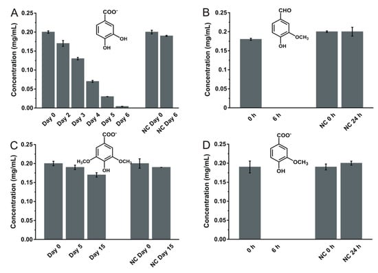Biotransformation of hydroxybenzoates such as protocatechuate (A), vanillin (B), syringate (C), and vanillate (D) by the B. licheniformis strain TAB7. Data are expressed as means ± standard deviation from triplicates. NC: negative control. Relevant chromatograms are shown in Figure S1, found in the Supplementary Data File.