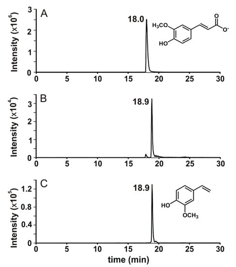 LC-MS/MS analysis of standard ferulate (A) and biotransformation product of ferulate by strain TAB7 (B), which is identical to that of standard 4-vinylguaiacol (C).