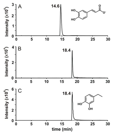 LC-MS/MS analysis of standard caffeate (A) and biotransformation product of caffeate by strain TAB7 (B), which is identical to that of standard 4-ethylcatechol (C).