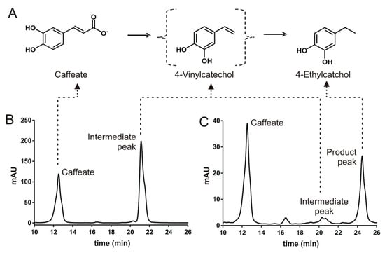 Putative biotransformation pathway of caffeate by B. licheniformis TAB7 (A), identified on the basis of HPLC analysis of culture extracts obtained after incubation with caffeate for 12 h (B) and 18 h (C) respectively. 4-Ethylcatechol was detected and identified by LC-MS/MS.