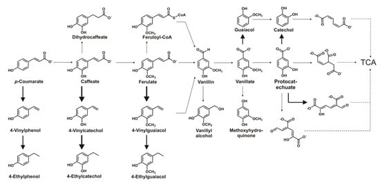 Several microorganisms have been reported to decarboxylate ferulate to 4-vinylguaiacol, and some can even further transform 4-vinylguaiacol to 4-ethylguaiacol [12,13,14,15,16]. While most of the reported organisms convert ferulate to other compounds like vanillin, vanillate, and protocatechuate via either 4-vinylguaiacol [17] or feruloyl-coA [18], TAB7 seems to convert ferulate to 4-vinylguaiacol as the final product. This conversion is catalyzed by phenolic acid decarboxylase (PAD), an enzyme known to decarboxylate ferulate, p-coumarate, and caffeate to their vinyl derivatives [19]. This, however, is not unique to TAB7 [14]. TAB7 conversion of ferulate to 4-vinylguaiacol could be important because 4-vinylguaiacol is less implicated in seed germination and plant growth inhibition [20,21,22]; thus, TAB7 may not only deodorize compost but can also improve it by reducing allelochemicals in compost cooperatively with other bacteria. The biotransformation profile (in HPLC) of p-coumarate biotransformation was markedly similar to that of ferulate (see Figure S1, Supplementary Data File). Hence, it seemed reasonable to infer that p-coumarate was decarboxylated to 4-vinylphenol.