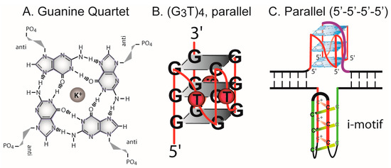 G-quadruplex and i-motif structures. (A) G4 guanine quartet with sugars in the anti configuration and a stabilizing K+ ion. (B) (G3T)4 parallel quadruplex. (C) A parallel G-quadruplex in duplex DNA opposite an i-motif.