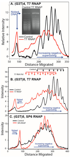 Plasmid topoisomers were analyzed for the relaxation of superhelical turns using agarose-chloroquine gel electrophoresis in 1.75% agarose gels run in 40 mM Tris, 50 mM potassium acetate, 1mM EDTA, pH 8.3, containing sufficient chloroquine to resolve individual topoisomers. Transcription reactions were performed basically as described [20] using T7 or SP6 RNA polymerases (New England Biolabs, Ipswich, MA, USA) in RNAPol buffer supplemented with 0.5 mM ATP, UTP, GTP, and CTP, 40 mM KCl and 20 µg/mL RNaseA, for 1–2 hr at 37 or 40 °C. Samples were precipitated with two volumes of ethanol and redissolved and digested with RNaseA H (New England Biolabs, Ipswich, MA, USA) as recommended.