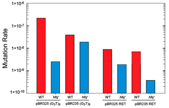 Effect of Hfq on mutation rates for (G3T)8 repeats in plasmids pBR325 and pBR235.