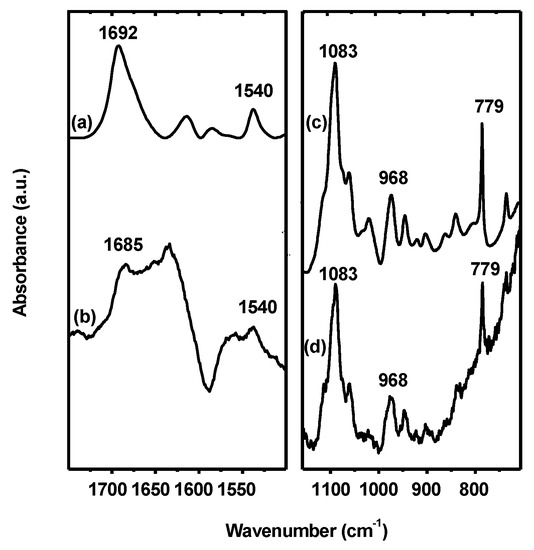 - Geinguenaud, F.; Calandrini, V.; Teixeira, J.; Mayer, C.; Liquier, J.; Lavelle, C.; Arluison, V. Conformational transition of DNA bound to Hfq probed by infrared spectroscopy. Phys. Chem. Chem. Phys. PCCP 2011, 13, 1222–1229. [Google Scholar] [CrossRef] [PubMed]