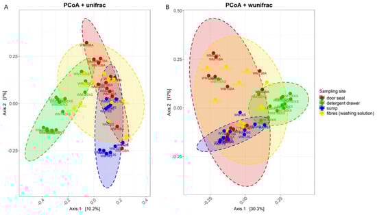 Principal Coordinate Analysis (PCoA) plot of unweighted (A) and weighted (B) UniFrac measures using the 16S rRNA gene sequencing data of 50 analysed washing machine samples. Colour indicates sampling site: door seal (red), detergent drawer (green), sump (blue) and fibres from washing solution (yellow). Ellipses correspond to 95% confidence intervals for each of the four sampling sites.