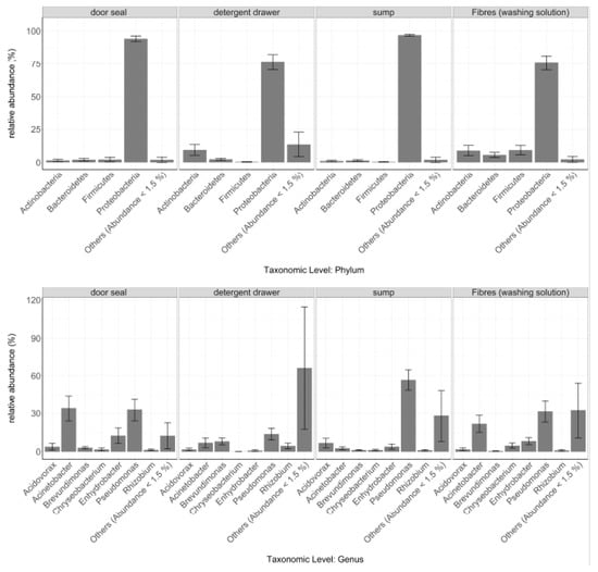 Relative abundances of the most abundant microbial phyla and genera at the different sampling sites. Only taxa with an overall relative abundance of ≥ 1.5% are shown Taxa with an overall relative abundance ≤ 1.5% were summed up as “Others”. Data are expressed as mean ± standard error (Door seal n = 13, Detergent drawer n = 13, Sump n = 12, Washing solution n = 12).