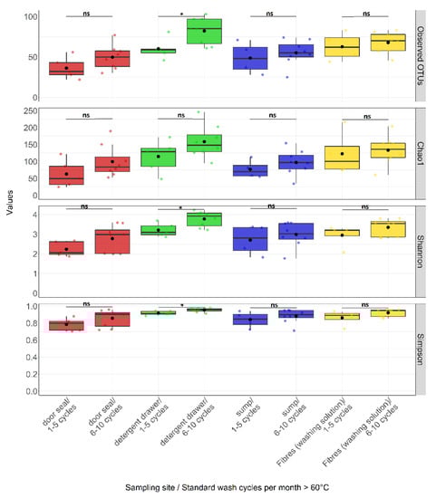 Box-whisker plots for the distribution of alpha diversity measures comparing sampling sites by standard wash cycle per month at temperatures ≥60 °C. Samples were categorized by sampling sites and the number of standard wash cycle per month at temperatures ≥60 °C. A box represent the 25% and 75% percentiles. The middle of the box represents the median. Mean values are displayed as black dots. The horizontal dashes above and below the boxes indicate the largest and smallest values, which were not classified as outliers. Colour indicates sampling site: door seal (red), detergent drawer (green), sump (blue) and fibres from washing solution (yellow). Coloured dots represent an individual sample. Statistical analysis was done using the Wilcoxon-Mann-Whitney-U tests for independent samples. p-values are indicated by asterisks, p < 0.05 (*) and ns = not significant.