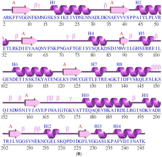 The secondary structure motifs of the FoxTPI protein were predicted with PDBsum [43] where a total of eight α-helices and eight β-sheets (Figure 2B) with an overall folding, “(β/α)β(β/α)6”, similar to other TPI barrel foldings.
