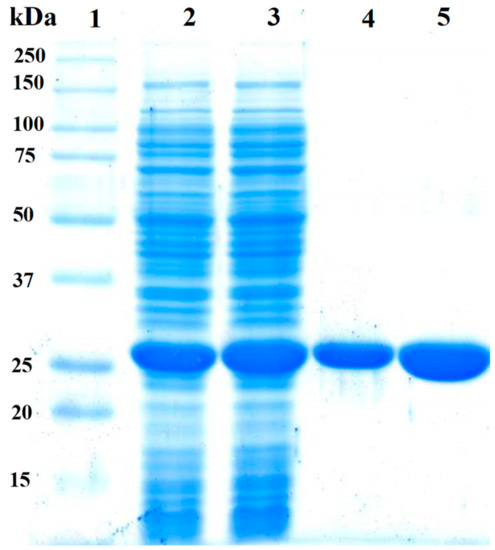The pET-3a-HISTEVP-FoxTPI vector constructed was used to express the recombinant protein (FoxTPI) in E. coli BL21 pLyS cells (DE3) under the conditions described in the Materials and Methods section. The recombinant FoxTPI protein was purified by the Ni Sepharose high performance affinity column (GE Healthcare) due, which are contained fused to an N-terminal His tag—the FoxTPI. The His tag was removed using the site-specific protease HisTEVP as previously reported [27]. Purified FoxTPI protein was analyzed SDS-PAGE gel, and a single band of approximately 27 kDa was observed (Figure 3; lane 4). To verify purity and rule out possible contamination with other proteins of purified FoxTPI, we loaded 20 µg of total protein in the same gel (Figure 3; lane 5), and only one band was observed (Figure 3; lane 5). Additionally, in the purification process, we obtained 32 mg of total protein per liter of culture with a specific activity of 5531 µmol·min−1·mg−1. The purity and concentration of purified enzyme allowed us to biochemically and functionally characterize the protein from F. oxysporum.