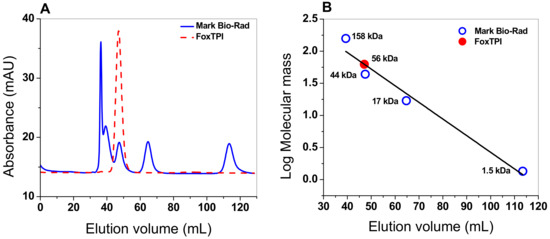 The oligomeric status of FoxTPI protein in solution was determined using gel filtration chromatography. As seen in Figure 4A, a single peak with an elution volume of 47 mL was observed. From the chromatogram obtained for the markers (gel filtration standard # 151-1901 from Bio-Rad), we found that protein mass of the FoxTPI protein corresponds to the native dimers with a relative molecular weigth (MW) of 56 kDa (Figure 4B), and which is in accordance with the MW expected from the amino acid sequence (27,000 × 2 = 54 kDa), whereas the sodium dodecyl sulfate-polyacrylamide gel electrophoresis (SDS-PAGE) analysis revealed a unique band of around 27 kDa (Figure 3). This result is consistent with those reported for other TPIs, such as of Saccharomyces cerevisiae [44], and parasites as Entamoeba histolytica (EhTPI), Trypanosoma brucei (TbTPI), T. cruzy (TcTPI), and Encephalitozoon intestinalis (EiTPI), which were reported with a molecular mass around 27 kDa [45,46,47,48].