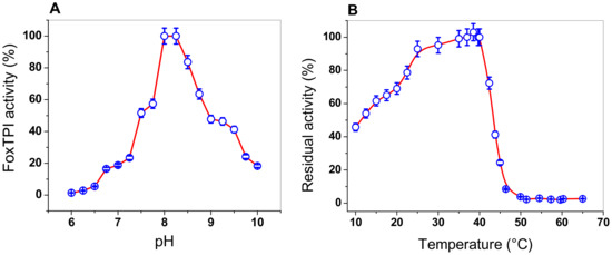 Determination of pH and temperature on the activity of FoxTPI. (A) effect of pH on the activity of the FoxTPI protein. The activities were tested by measuring the specific activity under standard conditions at each pH value. The residual activity was tested by measuring the activity under standard conditions at each pH value. The buffers used are described in Materials and Methods; (B) the effect of temperature on the activity of FoxTPI protein. The protein was incubated at different temperatures (from 10 to 65 °C) for 20 min in 50 mM Tris buffer at pH 8.0 and the residual activity was measured. In both assays, the data represent the mean ± SD from three independent measurements.