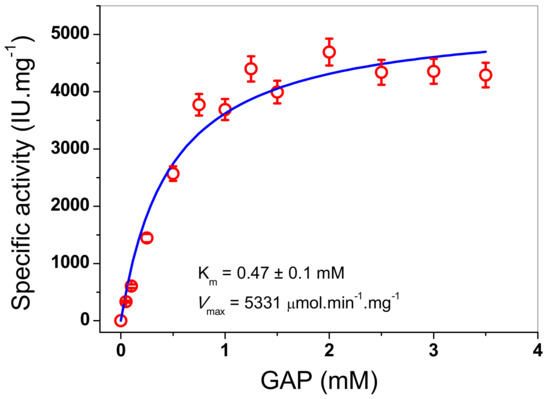 TPI enzymes from diverse organisms have been characterized, which have shown high catalytic activities in the reaction reversible of isomerization of the ketose dihydroxyacetone phosphate (DHAP) to aldose (D)-glyceraldehyde-3-phosphate (GAP). In this work, the kinetic parameters values for the recombinant FoxTPI enzyme were obtained using GAP as the substrate. The initial velocities of the FoxTPI enzyme were obtained at different substrate concentrations and fitted to the Michaelis-Menten equation by nonlinear regression calculations. Figure 6 shows that the FoxTPI has a canonical Michaelis-Menten saturation curve and shows affinity for GAP. Thus, we estimated the kinetic parameters: Vmax was 5331 μmol min−1 mg−1, and Km was 0.47 ± 0.1 mM. Interestingly, the data of Km and kcat values (2.9 × 105 min−1) obtained for FoxTPI are consistent with data reported in studies involving TPIs from other species (Table 1).