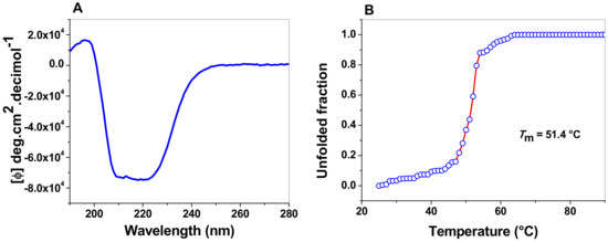 Spectroscopic properties of FoxTPI. (A) Far-UV CD spectra of the FoxTPI protein. The protein concentration was 0.4 mg/mL in TE buffer at 25 °C, and the experiments were performed in triplicate. The spectra of blanks were subtracted from those that contained the protein; (B) thermal denaturation of FoxTPI. The data are the mean of at least three independent experiments.
