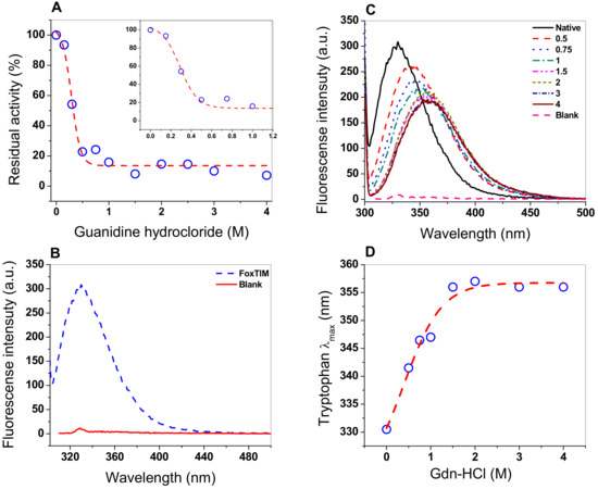 Stability analysis of FoxTPI protein in the presence of Gdn-HCl. (A) effect of the Gdn-HCl on the activity of FoxTPI; (B) fluorescence emission spectra of the native FoxTPI enzyme; (C) intrinsic fluorescence analysis of FoxTPI at various concentrations of Gdn-HCl; (D) maximum emission intrinsic fluorescence of the tryptophan/monomers produced by the denaturing induced by Gnd-HCl. Intrinsic fluorescence was obtained by subtracting the blank from the values of total fluorescence intensity. In all the assays, the protein was incubated at 0.2 mg/mL in Tris buffer (50 mM, pH 7.4), in the presence of the indicated concentrations of Gdn-HCl for 2 h at 37 °C; subsequently, the enzymatic activity and fluorescence intensity were obtained. All the experiments were performed in triplicate.