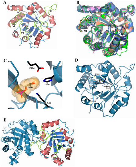 The superposition of eight “closed” TPI structures is displayed in Figure 9B. These proteins share a similar TPI barrel fold and, in our model, we observed that in both loop III and loop VI, there were major differences when making the structural superposition with other TPIs. The substrate-binding pocket of FoxTPI is created by three key residues: Lys12, His94, and Glu164, in a similar conformation to that of other TPIs (Figure 9C). In addition, the FoxTPI enzyme has three Cys in its amino acid sequence in the positions 125, 126, and 215. In our model, we observed that, according to its position, Cys125 in FoxTPI is the only one that shows equivalence with other Cys of other TPI enzymes (Figure 9D). For example, Cys 125 of FoxTPI (127 in most TPIs) is a strictly conserved amino acid, and it has been proposed that it is related to the correct folding of TPIs [44]. Finally, a dimeric structure of the FoxTPI model was built with SWISS-MODEL (Figure 9E) because the oligomeric status of FoxTPI protein in solution determined by gel filtration chromatography corresponds to the native dimers with a relative molecular weigth (MW) of 56 kDa.