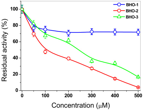 Inactivation assays for the FoxTPI with BHO1, BHO2, and BHO3 compunds. The enzyme was incubated at increasing concentrations of compounds. Afer 2 h of incubation at 37 °C, an aliquot was withdrawn, and the residual activity was determinated as described in the Materials and Methods section.