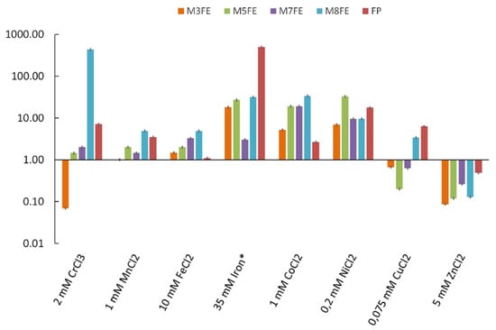 Survival rates as folds of the reference strain (905) of the mutants (M3FE, M5FE, M7FE, M8FE) and the final population (FP), represented in log-scale. The results were obtained using the MPN analysis under various metal stress conditions. Iron* indicates (NH4)2Fe(SO4)2.