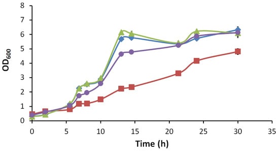3.2.2. Growth Behaviour and Extracellular Metabolite Profiles (Glucose, Ethanol, Acetate, Glycerol)