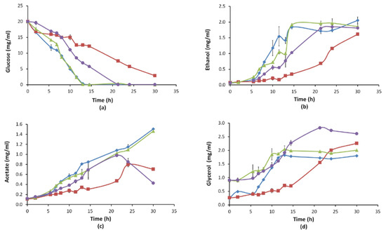 In line with the growth profiles, glucose consumption, ethanol, acetate and glycerol production profiles were also obtained (Figure 4).