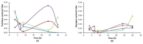 It was observed that the trehalose content of M8FE grown in the presence of iron stress was the highest, compared to all other cultures. However, after 25 h of cultivation, M8FE started to consume trehalose in the presence of iron stress (Figure 5).