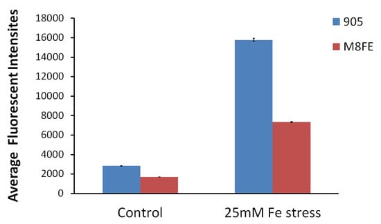 Fluorescent intensity values that indicate the ROS amounts of M8FE and 905 under control and iron stress conditions.