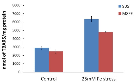 nmol TBARS/mg protein values of M8FE and 905, under control and iron stress conditions.