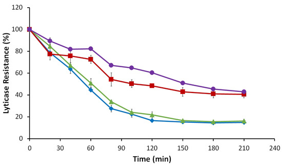 Lyticase susceptibilities of 905 and M8FE in the absence and presence of iron stress (◆ 905 under control condition, ■ 905 under iron stress condition, ▲ M8FE under control condition, ● M8FE under iron stress condition). Lyticase susceptibility was assessed as the percent decrease in lyticase resistance (initial value = 100%).
