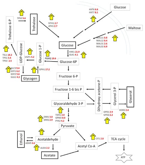 Our transcriptomic analysis results revealed that the gene GPH1, responsible for glycogen degradation, was also upregulated by 17.2-fold. The glycogen degradation product “Glucose 1-P” can be used as a substrate for trehalose biosynthesis or it can be converted to “Glucose 6-P” by the help of phosphoglucomutase encoded by PGM2 (19.6-fold upregulated in M8FE). Glucose 6-P would then be either used in glycolysis or glycerol pathways. Glycerol is produced by S. cerevisiae to cope with the osmotic stress, to manage cytosolic phosphate levels or to maintain NAD+/NADH redox balance [73]. According to our physiological analysis results, high glycerol production of M8FE was remarkable, particularly under the 15 mM (NH4)2Fe(SO4)2 stress condition. However, 905, under the same stress conditions, did not produce as much glycerol as M8FE. Thus, the glycerol production difference is most likely due to the robustness of M8FE against the iron stress condition. However, the ethanol production of M8FE was not as much as the glycerol production, implying that the robust M8FE under iron stress conditions possibly shifted the ethanol production pathway to the glycerol production pathway.