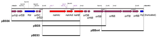 Genetic organization of the nah gene cluster of strain JF8. Red, blue, and magenta pentagons indicate naphthalene-degradative genes, transposase gene, and genes for hypothetical proteins. Restriction enzyme site and positions for primers are shown. The solid black bars under the map indicate DNA regions cloned into each plasmid.