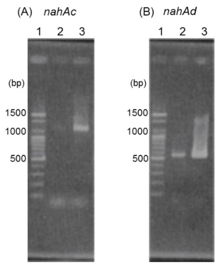 Geobacillus sp. JF8 was grown on LB plate at 60 °C for 8 h, then the resultant colonies were exposed to naphthalene vapor for 4 h to induce their degradative pathways. Total RNA was extracted from the JF8 cells using a RNeasy Mini Kit (Qiagen, Venlo, The Netherlands). The RNA samples were treated with DNase I (Thermo Fisher Scientific Inc). Reverse transcriptase (RT)-PCR was carried out with 1-ng RNA of each sample and OneStep RT-PCR kit (Qiagen) using primers; nAc-F: 5′-AGAACAAATCGAAGGCGTTT-3′ and nAc-R: 5′-TTTCCATTGACGCCAAATG-3′, and nAd-F: 5′-TGAGCTTTCGATACCGAGACA-3′ and nAd-R: 5′-ACCGCTAAGTTATCCATCCCT -3′. The primer sets of nAc-F and nAc-R were used to amplify nahAc gene and those of nAd-F and nAd-R were for nahAd gene (Figure 2). The conditions for the RT-PCR amplification were as follows; 50 °C for 30 min; 95 °C for 15 min; followed by 35 cycles of 94 °C for 30 s, 48 °C for 1 min, and 72 °C for 5 min. For negative controls, the initial incubation at 50 °C was omitted.