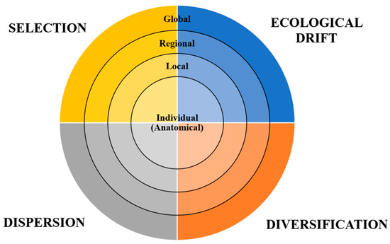 Current conceptions of biogeography and ecology have become inextricably bound, and the observation of distinct biogeographical patterns in nature has proven to be a watershed moment in shaping the discourse surrounding the forces governing all community assembly. The most recent and widely cited of these ecological approaches have drawn on broader principles in evolutionary biology and population genetics, including neutral [11,12,13,14] and metacommunity theory [15,16,17]. Other models have examined the relative contributions of historical contingencies in explaining these spatial relationships [2,18,19,20]. However, recognizing that the literature had become replete with seemingly divergent frameworks which differed more in the emphases placed on ecological phenomena rather than the concepts themselves—a “mess”, as described by prominent British ecologist John Lawton [21]—Mark Vellend proposed an elegant framework to explain ecological (and by extension, biogeographical) patterns by considering the interplay between four factors: selection, drift, speciation and dispersal [22]. Importantly, Vellend does not contend that all four factors are equally important in determining the composition of any given ecosystem; on the contrary, it is the ecosystem and its inhabitants within this environment that determine the relative importance of any given factor. The model’s inherent simplicity, structure, and above all conciliation of the age-old niche (deterministic) vs. neutral (stochastic) debates has seen it become an attractive framework for studying both macrobial and microbial communities [1,23,24]. Vellend did not explicitly intend for his model to be applied to microbial ecology or biogeography per se; however, the pace at which sequencing data is now being acquired from metagenomic studies demands a sufficiently robust model to provide fundamental insights and hypotheses that may be used to inform current and future biological inquiry [25].