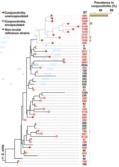 Phylogenetic tree of conjunctivitis strains of S. pneumoniae based on multilocus sequence typing, constructed using the phylogeny software PhyML [115]. An associated bar graph demonstrates the percentage prevalence in 271 sequenced strains from the US. The analysis of single nucleotide polymorphisms within these strains demonstrated that the overwhelming majority of nonencapsulated conjunctivitis strains localized to a distinct phylogenetic cluster. Reprinted with author permission [10].
