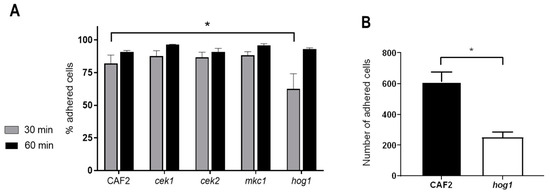 Cellular adhesion to abiotic plastic surfaces such as catheters and artificial joints is particularly important in C. albicans pathogenicity as it leads to the formation of biofilms on these devices [32]. Adhesion to polystyrene was performed using conventional cell culture plastic plates. The hog1Δ mutant strain adhered less to the polystyrene surface than the wild-type under static conditions at 30 min, showing 62.5% ± 11.7% adhesion compared to 82% ± 6.5% for CAF2 (p < 0.05, one-way ANOVA). Deletion of the other three MAP kinases had no impact on adhesion at this time At extended interaction periods (60 min), all analysed strains were able to adhere to the polystyrene surface at levels similar to the wild-type (Figure 1A).