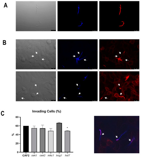 The terminal MAPKs Cek1 and Cek2 are both regulated by the MAPKK Hst7. We, therefore, analysed the invasive ability of strains defective in the HST7 gene. Interestingly, the absence of Hst7 significantly reduced invasion to only 48.7 ± 0.62% (p = 0.003). We conclude that the HST7 MAPKK (Cek1/Cek2-mediated) pathway plays a role in epithelial cell invasion in this model.