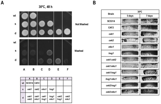 - Correia, I.; Roman, E.; Prieto, D.; Eisman, B.; Pla, J. Complementary roles of the Cek1 and Cek2 MAP kinases in Candida albicans cell-wall biogenesis. Future Microbiol. 2016, 11, 51–67. [Google Scholar] [CrossRef]