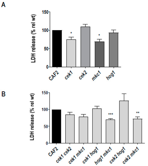 C. albicans cells were used to infect a confluent oral epithelial cell monolayer (TR146) for 24 h and damage assessed by measuring epithelial lactate dehydrogenase (LDH) release. Deletion of CEK1 or MKC1 reduced damage by 25% and 31%, respectively, whilst cek2Δ and hog1Δ exhibited damage levels comparable to the wild type (Figure 4A). Mkc1 has been previously implicated in epithelial damage [3] and here, we additionally demonstrate a role for the Cek1-mediated pathway in this process.