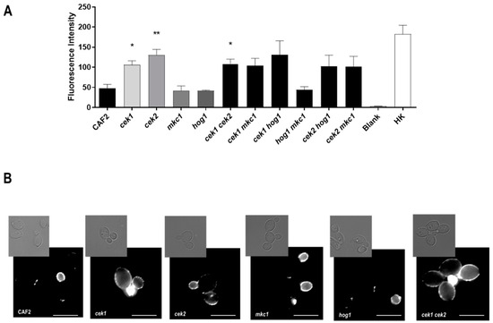 Analysis of β-glucan exposure in MAPK mutants. (A) Mean values of the fluorescence intensity for each strain (arbitrary units) and the standard error of the mean (SEM) from three independent experiments are shown. Heat-killed cells (HK), used as positive control Blank refers to cells treated only with the secondary antibody. * p < 0.05, ** p < 0.01 (B) Fluorescence microscopy analysis of cells β glucan exposure. Representative pictures of fluorescence microscopy analysis Pictures were taken and processed likewise for brightness and contrast adjustments. Upper panels, brightfield; lower panels, immunofluorescence microscopy. The white bar represents 5 µm.
