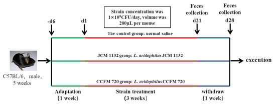Animal experimental design. Eighteen mice were randomly and equally divided into three groups: control, L. acidophilus JCM 1132 and CCFM 720. After adaptation, the mice in the control group were gavaged with normal saline for 3 weeks. The mice in the JCM 1132 and CCFM 720 groups were respectively gavaged with 1 × 109 CFU of JCM 1132 or CCFM 720 per mouse for 3 weeks. For all groups, gavage was then withdrawn for 1 week. Faeces were collected after the 3-week gavage period and 1-week withdrawal period (days 21 and 28, respectively).