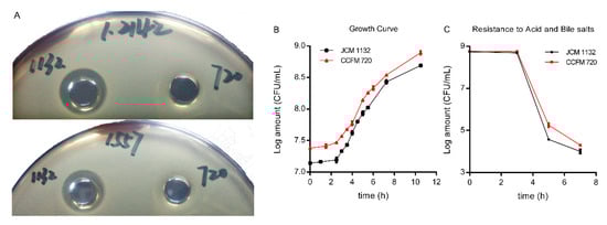 The growth curves, generation times and adherence index to the Caco-2 cell line of the two strains were very similar (Figure 2B and Table 5). Furthermore, the levels of resistance to acid and bile salts were similar in both strains (Figure 2C). Based on these results, we determined that JCM 1132 and CCFM 720 behaved similarly with respect to all measured growth characteristics except bacteriocin production.