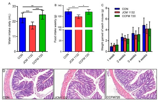 Physiological effects and morphological observations of colon tissues on different groups of mice gavaged with L. acidophilus JCM 1132 and CCFM 720. (A) Daily water intakes of different groups of mice. (B) Weekly food intakes of different groups of mice. (C) Changes in the bodyweight of each mouse in various groups. The results are expressed as means ± standard deviations. * p < 0.05, ** p < 0.01, *** p < 0.001. (D) Morphological observations of colon tissues from different groups of mice. CON, control group. JCM 1132, group gavaged with L. acidophilus JCM 1132. CCFM 720, group gavaged with L. acidophilus CCFM 720. n = 6 per group. Slice magnification: 200×.