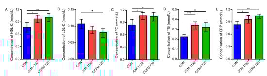 Concentrations of biochemical factors in serum samples from different groups of mice. (A) Concentration of HDL-C. (B) Concentration of LDL-C. (C) Concentration of TC. (D) Concentration of TG. (E) Concentration of CRP. CON, control group. JCM 1132, group gavaged with L. acidophilus JCM 1132. CCFM 720, group gavaged with L. acidophilus CCFM 720. n = 6 for each group. The results are expressed as means ± standard deviations. * p < 0.05, ** p < 0.01, *** p < 0.001. HDL-C, high-density lipoprotein cholesterol; LDL-C, low-density lipoprotein cholesterol; TC, total cholesterol; TG, triglycerides; CRP, C-reactive protein.
