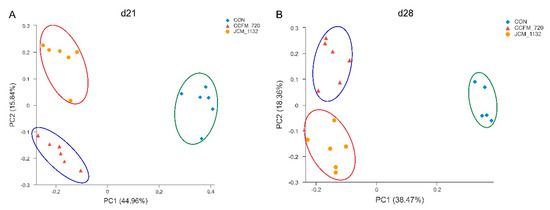 Principal coordinate analysis (PCoA) plot based on a Bray–Curtis analysis. (A) Day 21. (B) Day 28. ◆: control; ●: JCM 1132; ▲: CCFM720. Each coloured symbol represents the composition of the faecal microbiota in a single mouse; n = 6 per group. β diversity in the microbial communities from different groups of mice on day 21. β diversity in the microbial communities from different groups of mice on day 28.