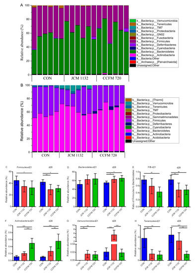 The faecal microbiota measured on days 21 (Figure 8A) and 28 (Figure 8B) were mainly composed of six phyla (sum of relative abundance <95%), including Firmicutes, Bacteroidetes, Actinobacteria, Proteobacteria, Tenericutes and Verrucomicrobia. Of these, Firmicutes and Bacteroidetes accounted for the largest proportions. More detailed descriptions of changes in the phyla of different groups are presented below (Figure 8).