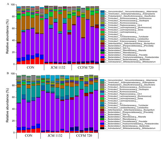 Tenericutes: The relative abundance of Tenericutes was significantly higher in the control group than in the JCM 1132 and CCFM 720 groups (p < 0.01) on day 21. However, the relative abundance increased considerably on day 28 in the JCM 1132 group but not in the CCFM 720 group, such that the abundance in the JCM 1132 and control groups did not differ significantly and both were significantly higher than the abundance in the CCFM 720 group (p < 0.01).