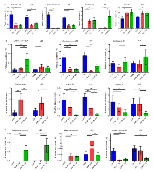 Genus-level changes in the faecal microbiota in different groups of mice on days 21 and 28. Changes after gavage for 3 weeks (day 21). Changes after a 1-week withdrawal period (day 28). (A,B) The relative abundance of the main genera (>0.1%) in different groups. CON, control group. JCM 1132, group gavaged with L. acidophilus JCM 1132. CCFM 720, group gavaged with L. acidophilus CCFM 720. n = 6 per group. (C–E) Changes in the levels of main genera in the faecal microbiota of mice on days 21 and 28. CON, control group. JCM 1132, group gavaged with L. acidophilus JCM 1132. CCFM 720, group gavaged with L. acidophilus CCFM 720. n = 6 per group. The results are expressed as means ± standard deviations. * p < 0.05, ** p < 0.01, *** p < 0.001.