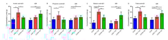Concentrations of short-chain fatty acids (SCFAs) in the faeces from different groups of mice on days 21 and 28. (A) Acetic acid. (B) Propionic acid. (C) Butyric acid. (D) Total acid. CON, control group. JCM 1132, group gavaged with L. acidophilus JCM 1132. CCFM 720, group gavaged with L. acidophilus CCFM 720. n = 6 per group. The results are expressed as means ± standard deviations. * p < 0.05, ** p < 0.01, *** p < 0.001.